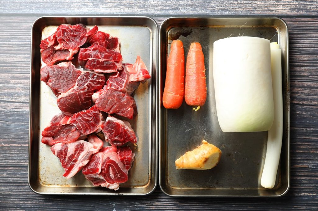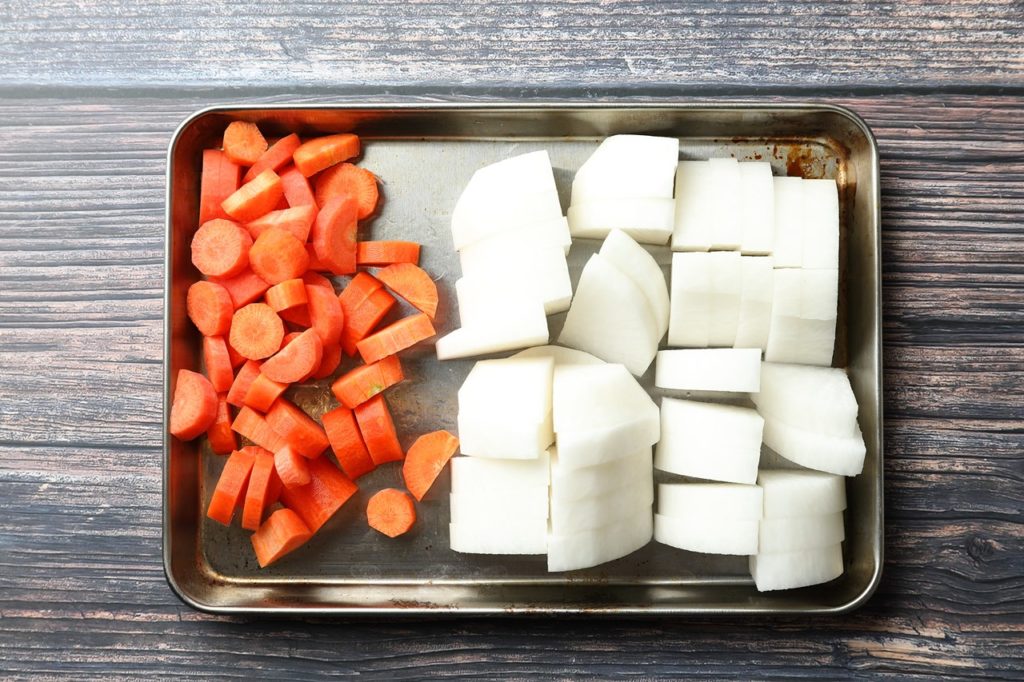 ③人参、大根はそれぞれ適度な大きさにカットしておく。