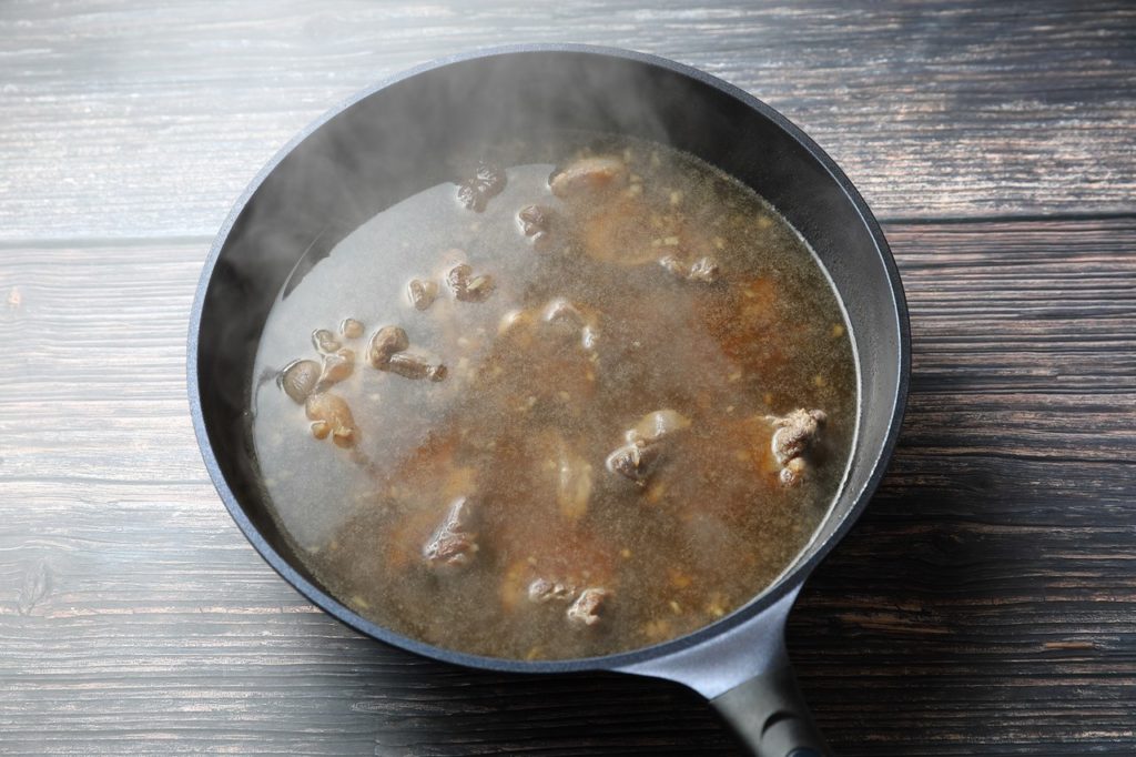②肉が焼けたら生姜、醤油、砂糖、酒、出汁をひたひたになるまで入れ2~3時間、肉が柔らかくなるまで煮込んでいく。途中水分がなくなってきたら肉が覆いかぶさるくらいに水を追加していく。