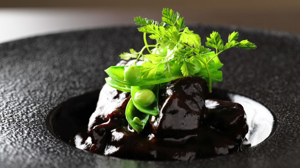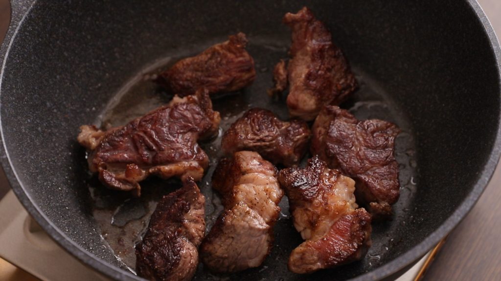 - 1.3.0.3 ③牛スネ肉に黒コショウ、塩をして良い焼き色がつくまでしっかりと焼く。