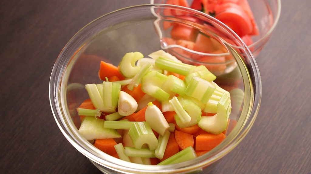 ①野菜類は適度な大きさにカットする。トマトだけ別にしておく。