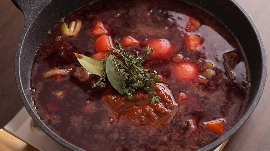 - 1.3.0.4 ④赤ワイン、デミグラス缶、炒めた野菜類、トマト、あればタイム、ローリエを入れ煮込んでいく。