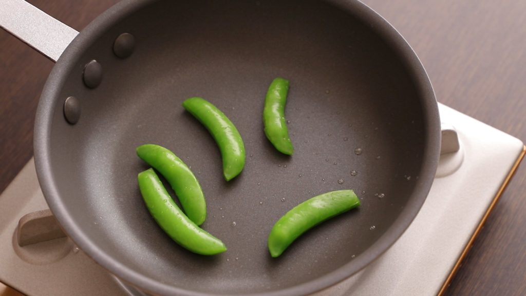 - 1.3.0.9 ⑨付け合わせのスナップエンドウを準備する。塩ゆで→オリーブオイル、塩で軽く炒める。