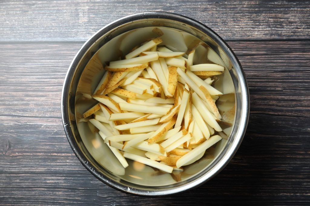 ①イモを良く洗い、皮ごと棒状にカットして水が透明になるまで数回水を変え、つけておく。