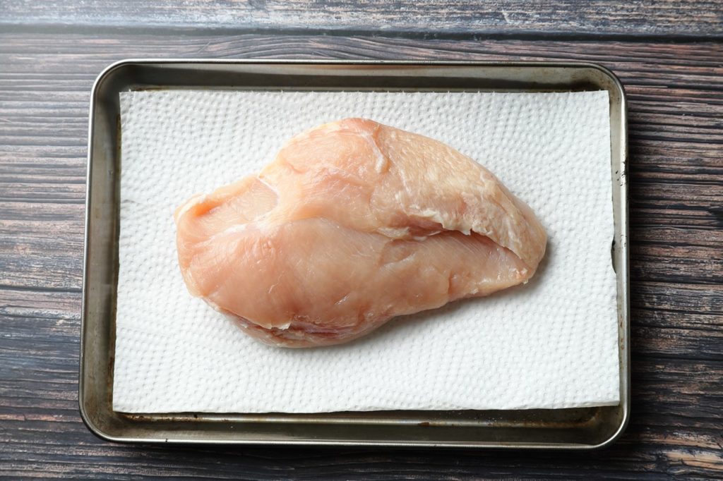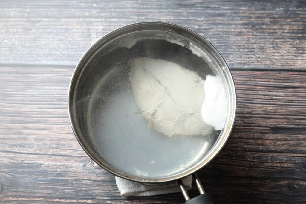 ①鍋に水をたっぷり入れ沸騰させ、皮を取った鶏むね肉を入れ火を消し鍋蓋をして1時間程度放置して火を入れていく。