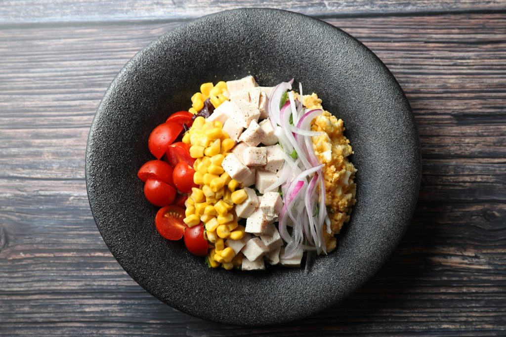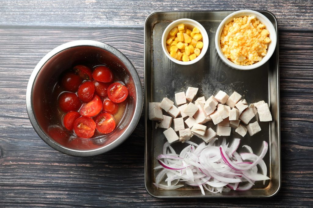 ②プチトマトマリネは調味料を全て合わせた中に1/2に切ったプチトマトを入れ漬けておく。ゆでたまごはフォークなどでほぐしておく。赤玉ねぎはスライスにして水につけ、その後水を切っておく。鶏むね肉に火が入ったら角切りにして用意しておく。