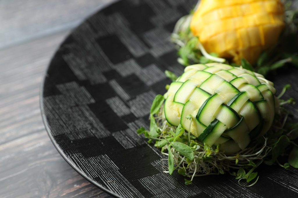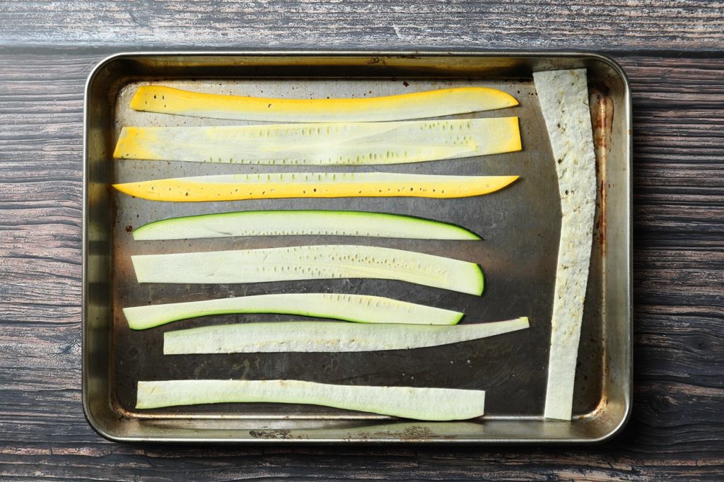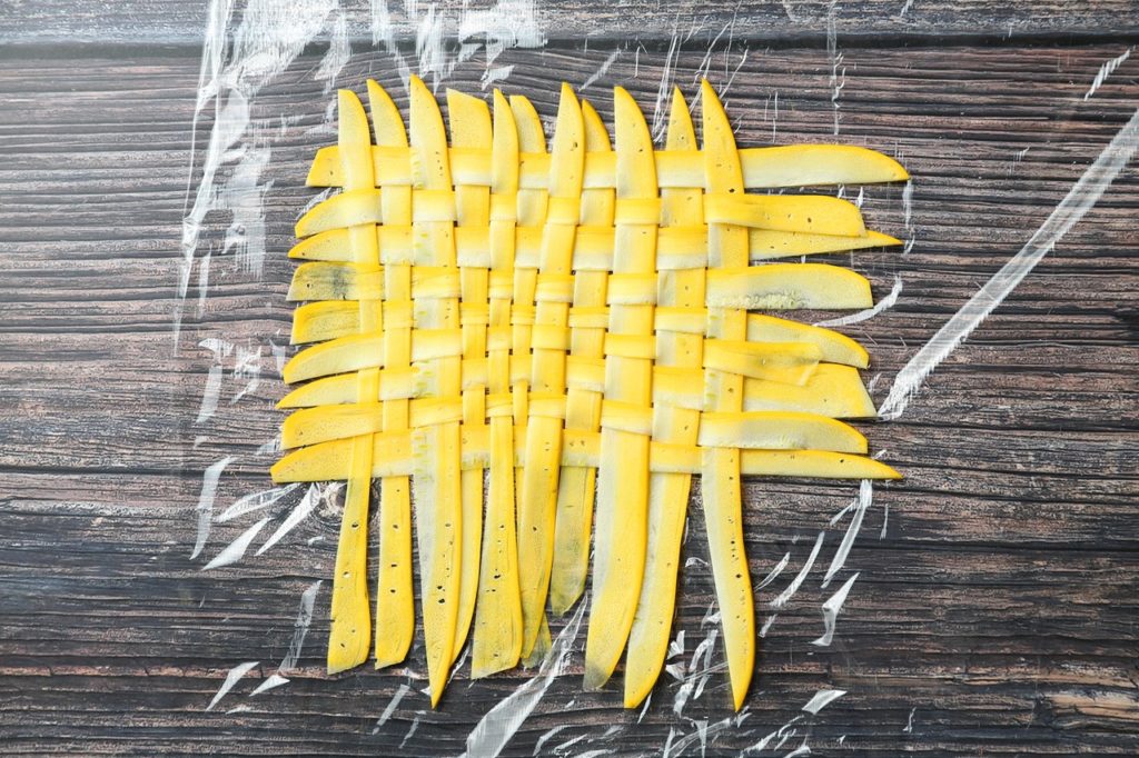 個人的には生のズッキーニは食べにくいと思うのでスライスを軽くボイルしてから編み込むか、生のスライスを編み込んで最後にボイルすることをオススメします。