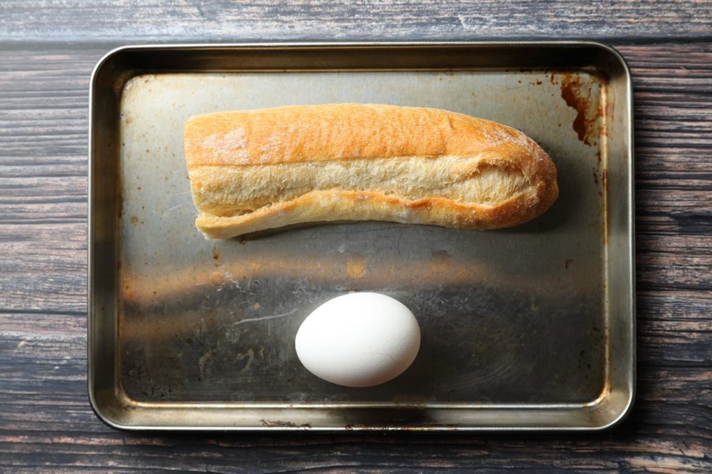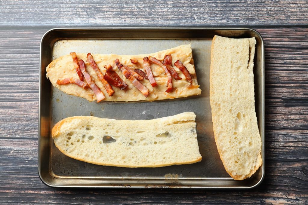 ②バゲット1/2本を3枚にスライスして一番下にベシャメルソースと炒めたベーコンをのせる。
