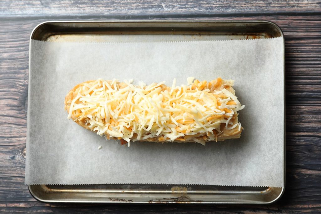 ③その上に2枚目のバゲットスライスをのせベシャメルソース、たっぷりのチーズをのせて190度のオーブンで焼き色がつくまで入れる。