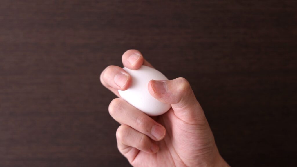 ①卵の握り方は縦に、人差し指と中指、親指3点で写真のように握る。
