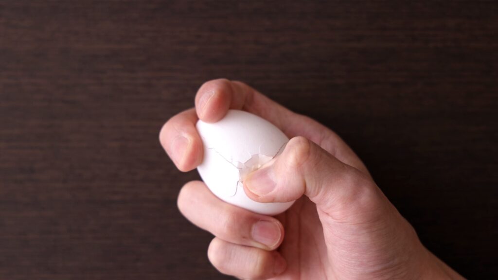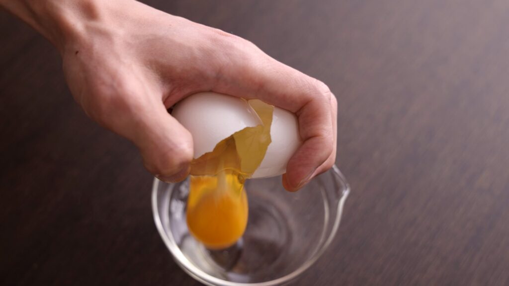 ※卵は平らな面で叩いてヒビを入れないと綺麗に割れません。机の角などで叩いてヒビを入れると割った後に殻が入ったり、綺麗に割れてくれない場合が多いので必ず平らな面で行いましょう。
