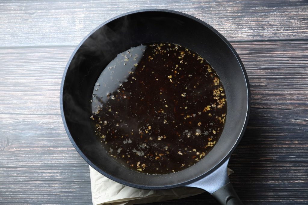 ①鍋に砂糖と少しの水を入れ少し茶色いキャラメル状にする。茶色くなったところで赤ワイン、みりんを入れ少し煮詰める。