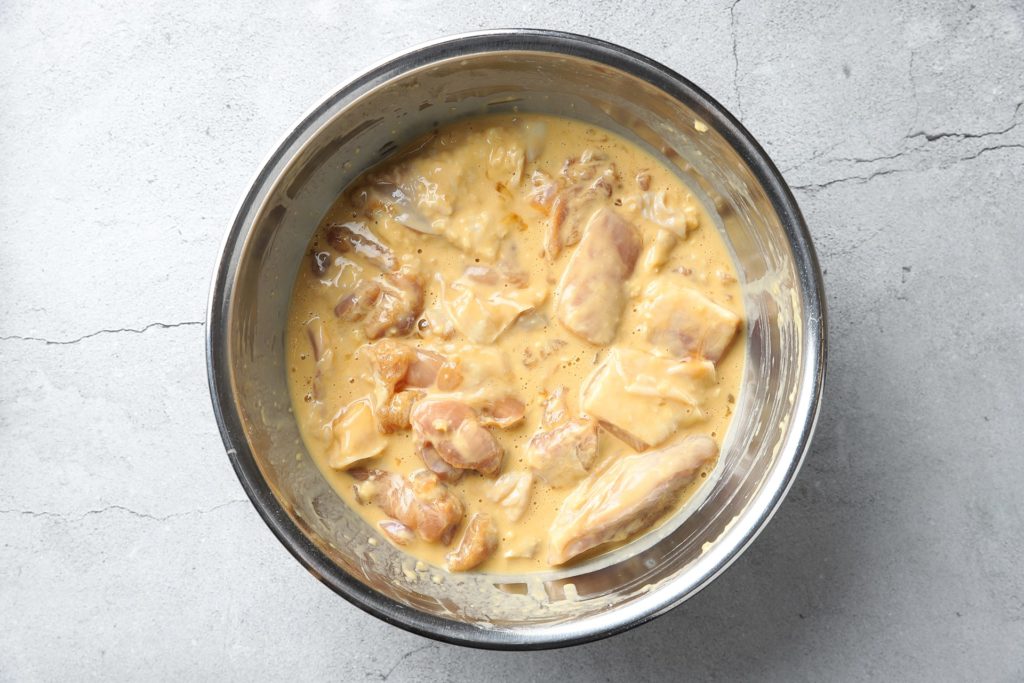 ②醤油、酒、みりん、はちみつ、生姜、ニンニク、卵、薄力粉、片栗粉をカットしたもも肉に全て合わせ半日程度漬けておく