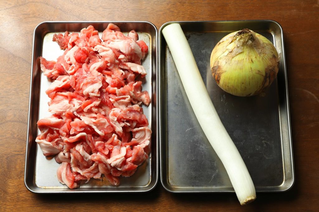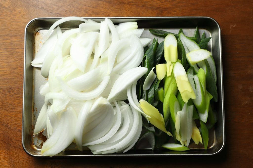 ①玉ねぎは厚めのスライス、長ネギがある場合は(緑色の部分)斜(斜め)に切っておく。