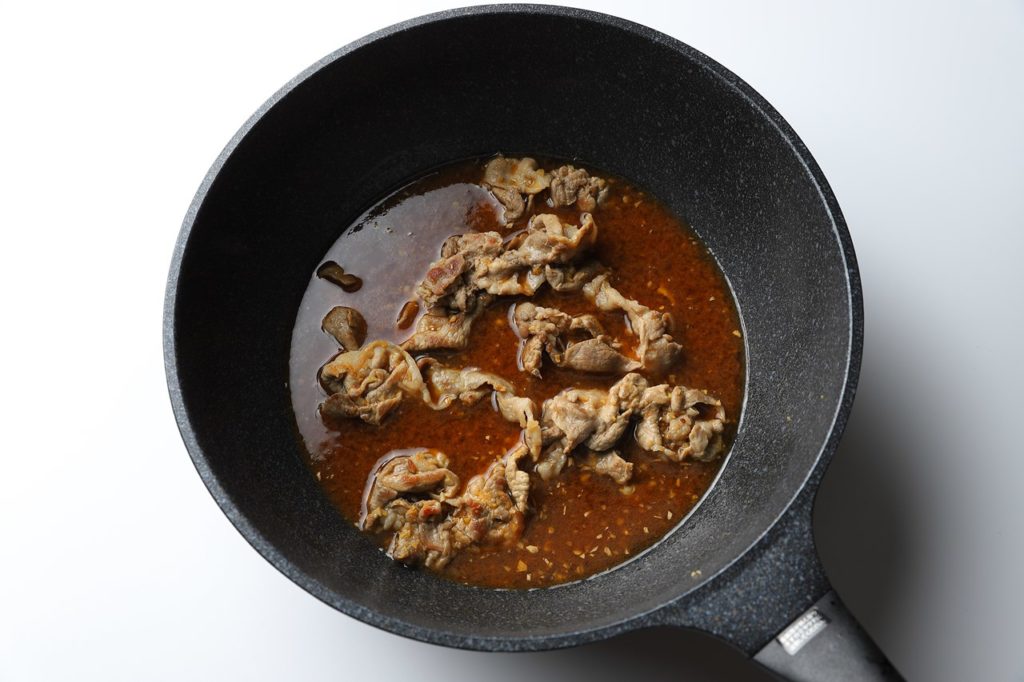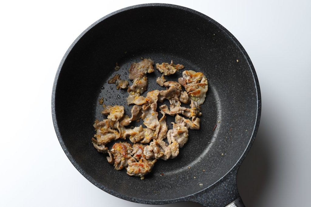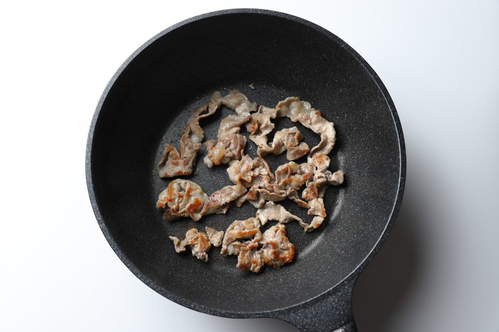 ①豚コマ肉を油をひいたフライパンで焼いていく