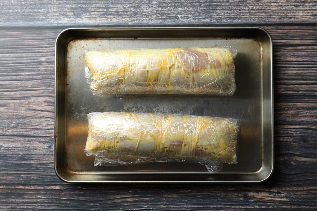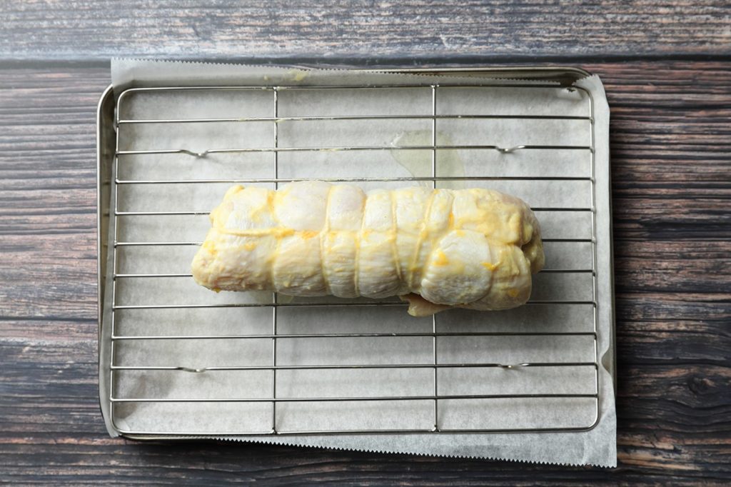 ①マーマレードマスタード液を作る。全ての材料を混ぜ合わせ、鶏もも肉(全体に軽く塩をする)にしっかり漬けていく。細長く丸め、タコ糸で縛ってラップで包み1日程度漬けておく。