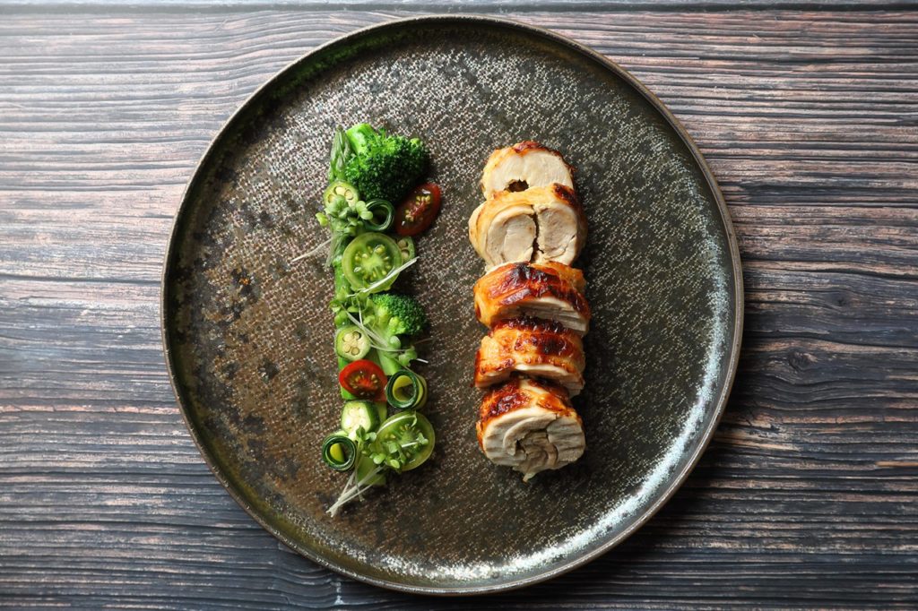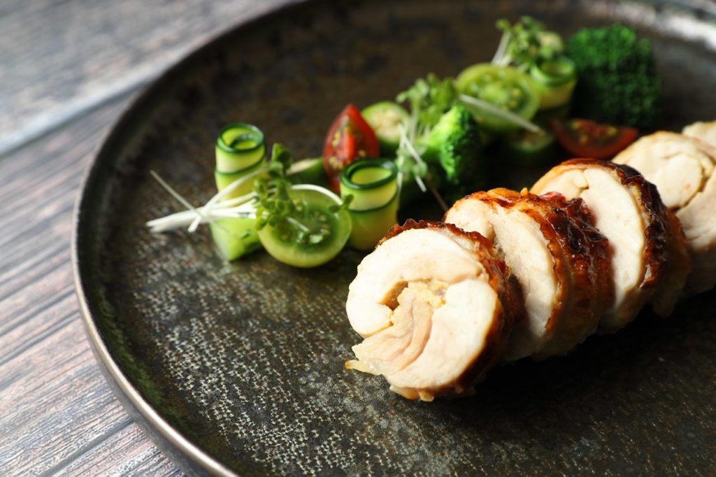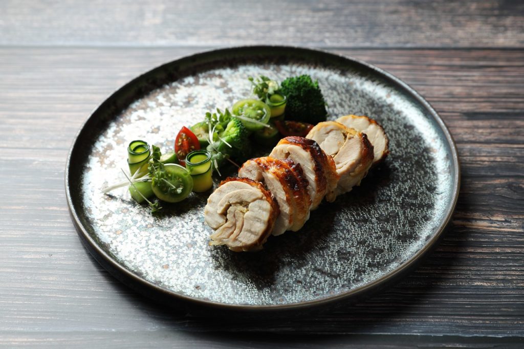 ③付け合わせ野菜はそれぞれ火を入れておき盛り付ける。焼けた鶏肉もタコ糸を外しカットして盛り付ける。
