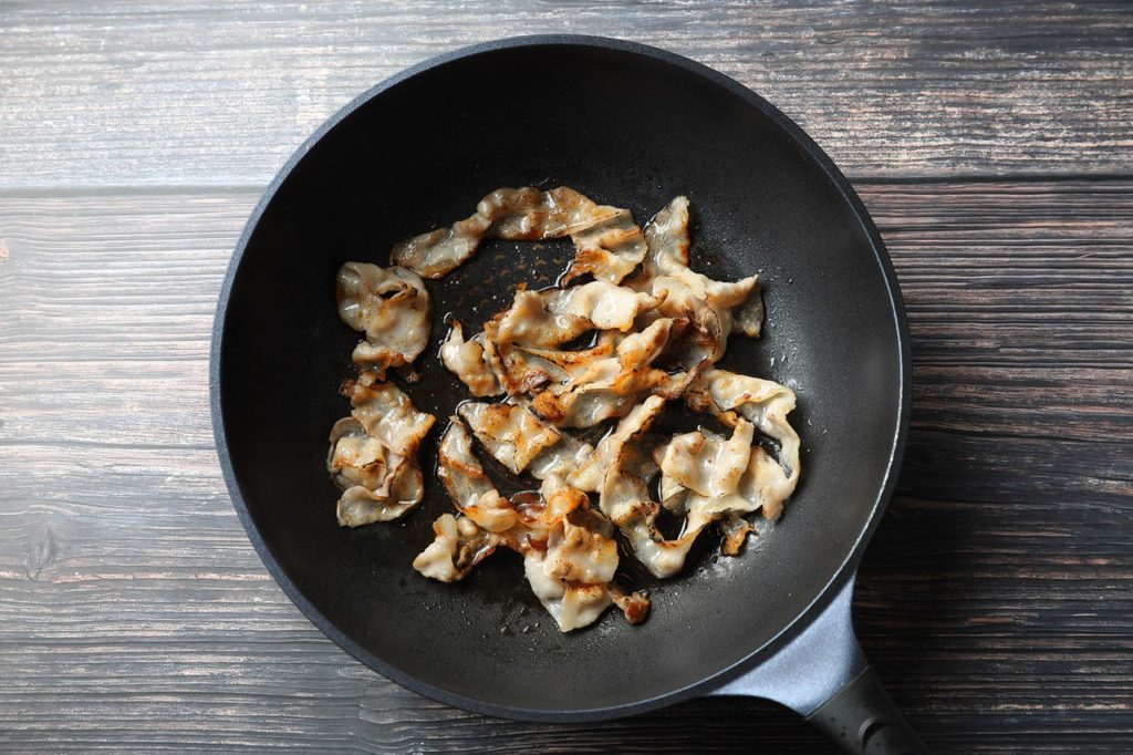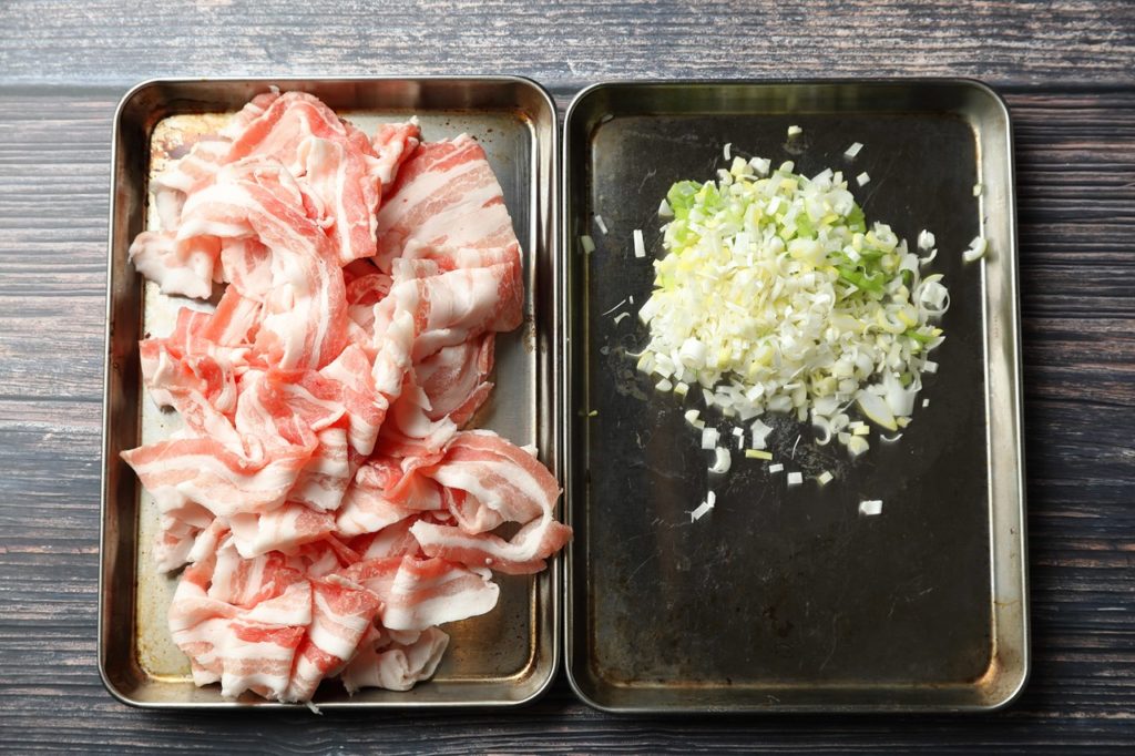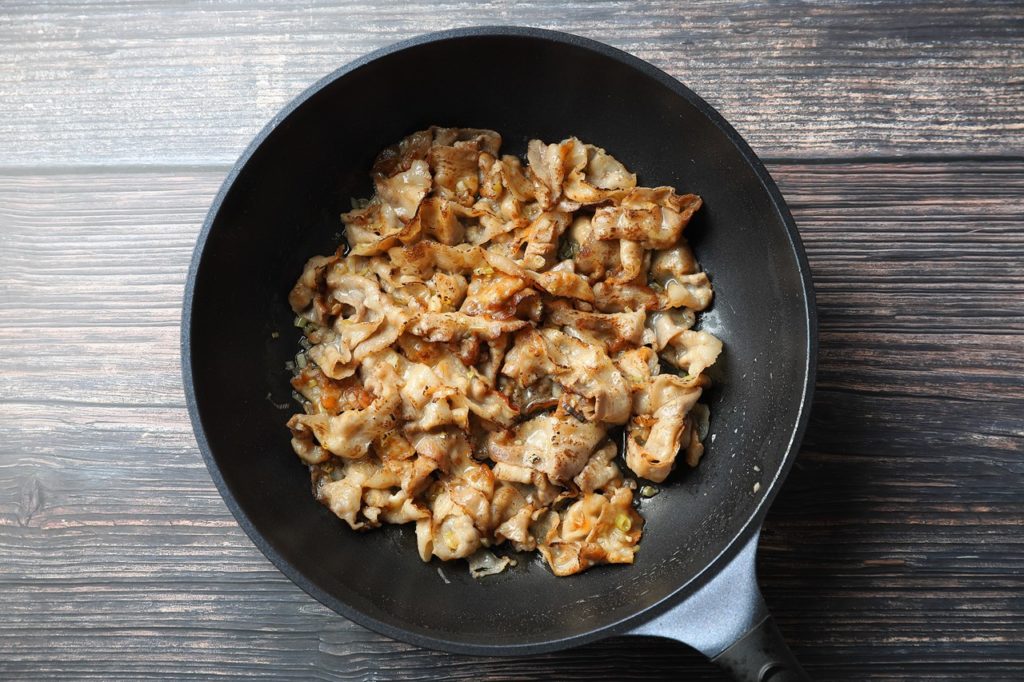②フライパンで豚バラスライスを焼いていく。肉が焼けたら一度肉を取り出し、余分な脂をふき取る。