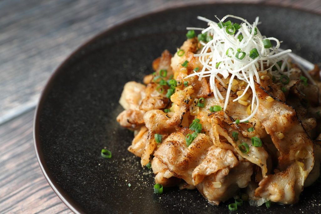 ④器にごはん、焼いた肉を盛り付けあればトッピングに白髪ねぎ、小葱、ブラックペッパーをふりかけ完成。