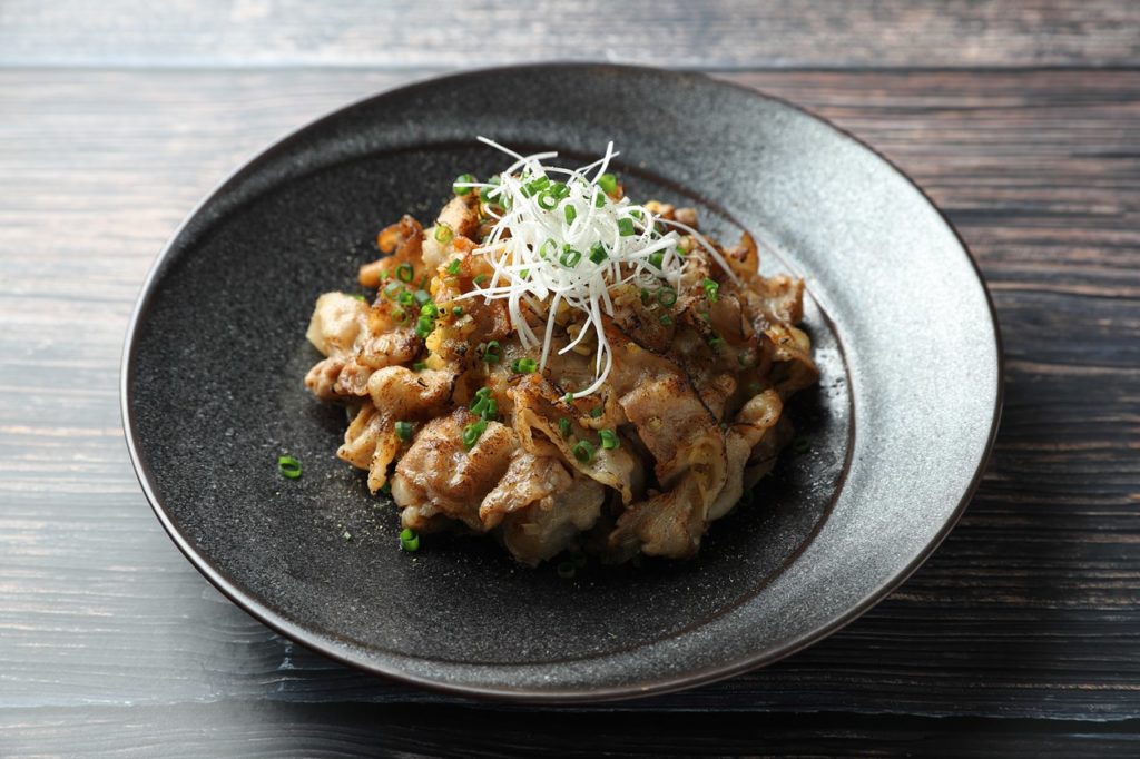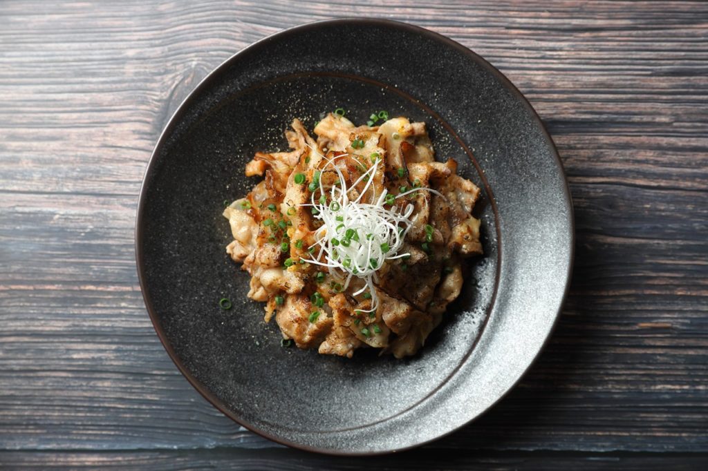 ④器にごはん、焼いた肉を盛り付けあればトッピングに白髪ねぎ、小葱、ブラックペッパーをふりかけ完成。