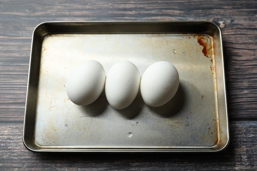 ①沸騰したお湯にお酢を少し入れしっかり冷えている卵を6分30秒茹でる。その後しっかり冷やす。