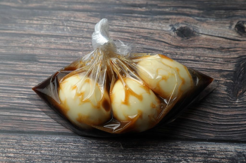 ②卵の殻を剥いてジップロック、又は食品用袋に角煮の煮汁と一緒に1日程度漬け込む。