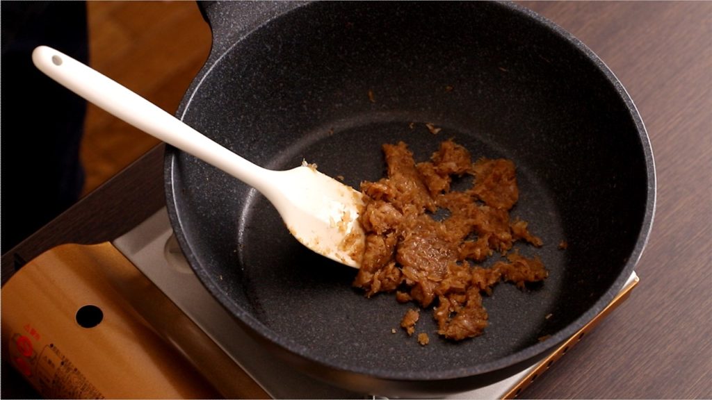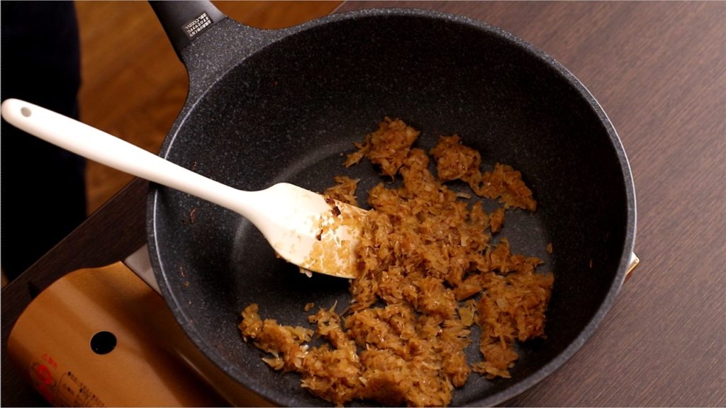 鍋に焼き色(焦げ)が付いてきたらその都度水を入れ、その焼き色(焦げ)を水を介して玉ねぎに移していきます。