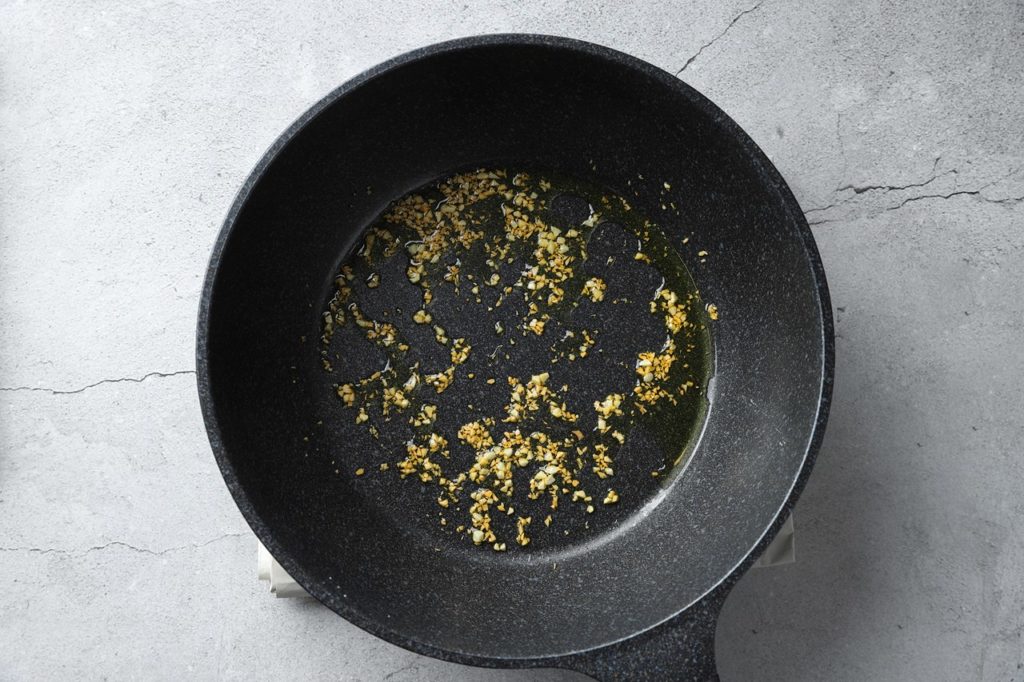 ①オリーブオイルでニンニクのみじん切りを茶色くなるまで火を入れる