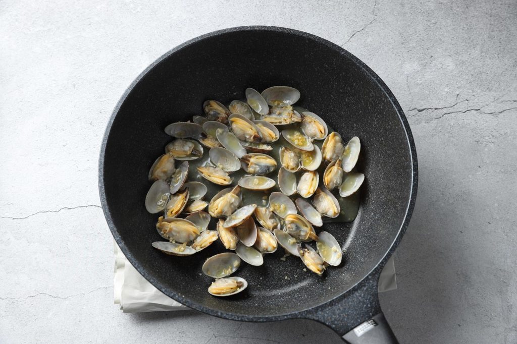 ②アサリ、白ワインを入れフライパンに蓋をして強火でアサリを開ける