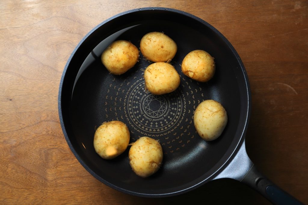 ④フライパンに油を多めにひき、切ったジャガイモを揚げ焼きにしていく。(塩コショウをする)