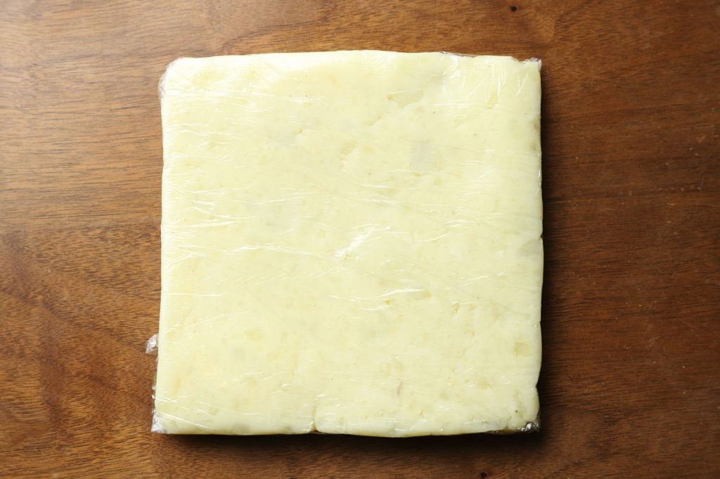 ④写真のようにラップで包み、冷やし固める。