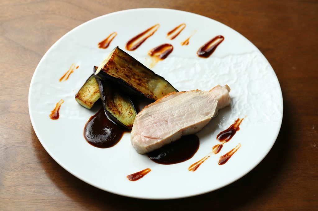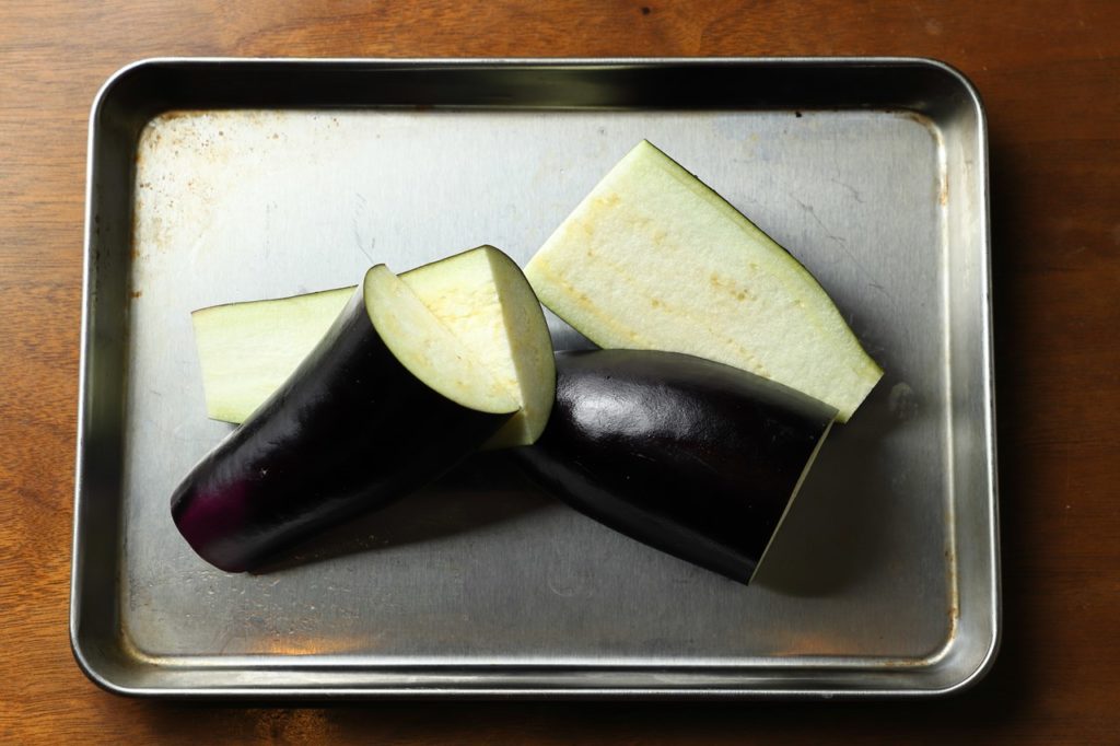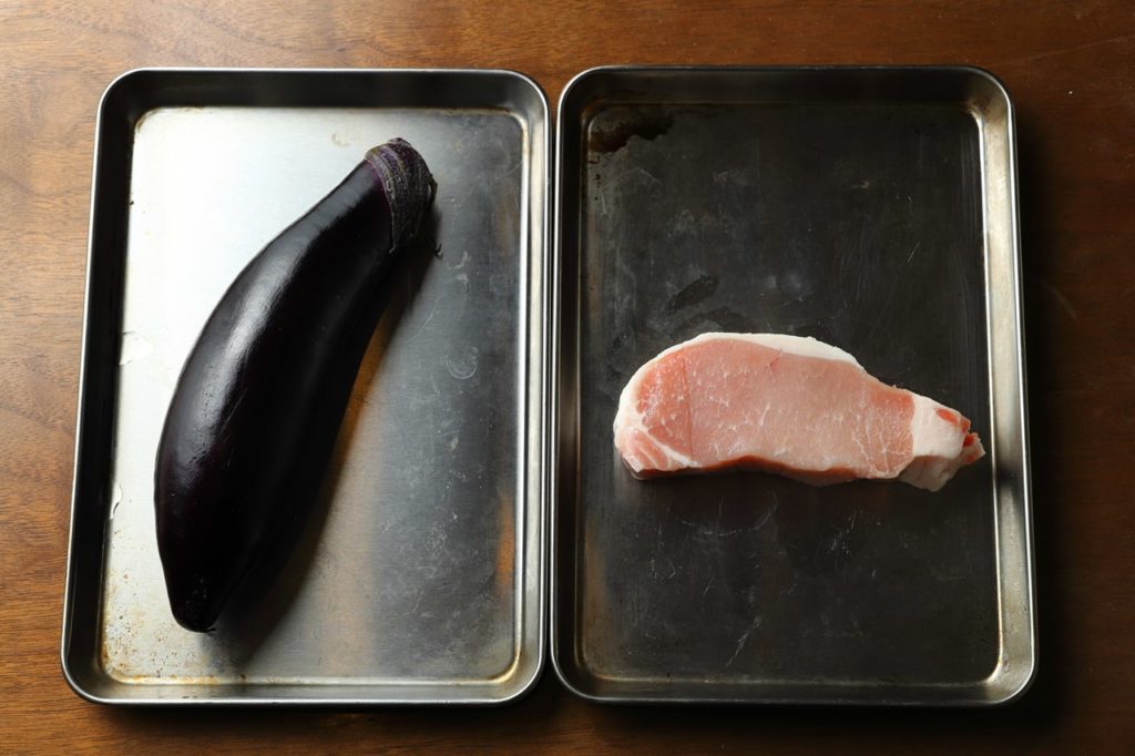 - 1.2.0.4 ④付け合わせのなすを油をひいたフライパンでしっかり焼いていく。塩コショウで味付けをする。
