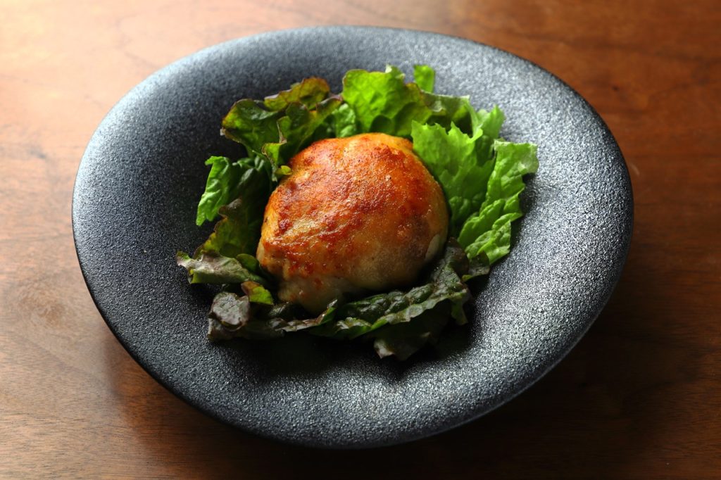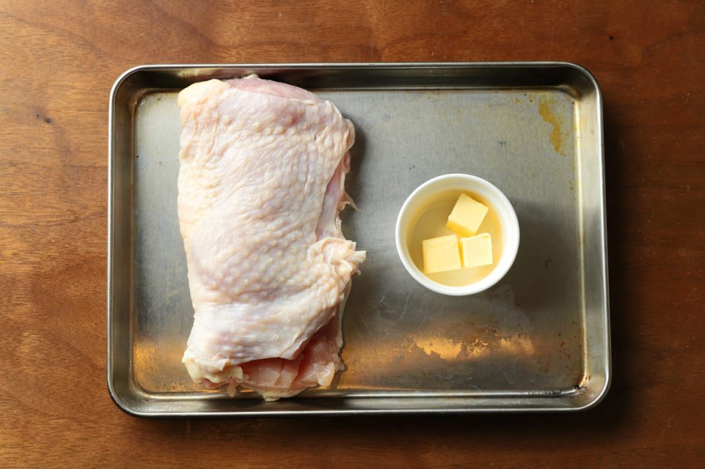 ①鶏モモ肉の内側(皮面でない方)に軽く塩をしバターを包み込み、丸く成型する。