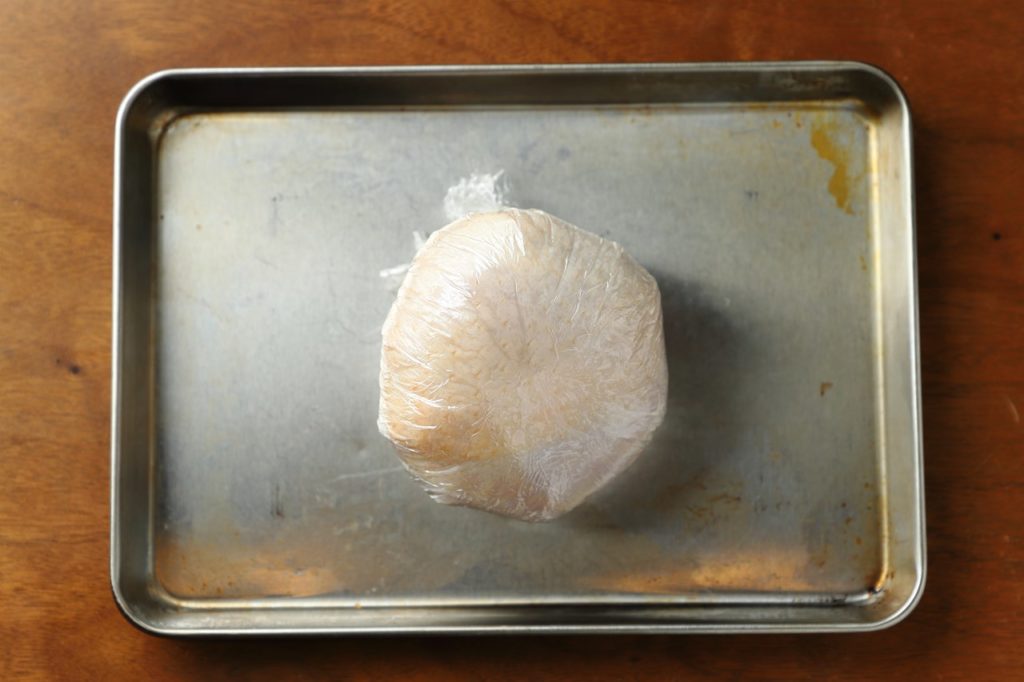 - 1.2.0.1 ①鶏モモ肉の内側(皮面でない方)に軽く塩をしバターを包み込み、丸く成型する。 ラップで上手く包んで写真のように丸める。肉を包んだラップに爪楊枝で数か所ぶつぶつと穴をあけておく。