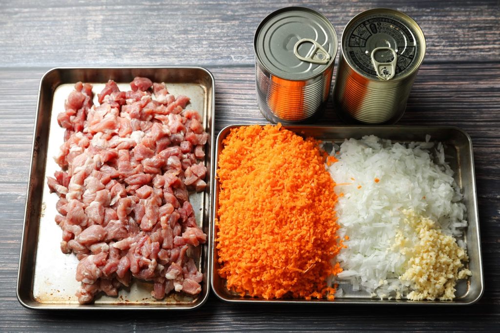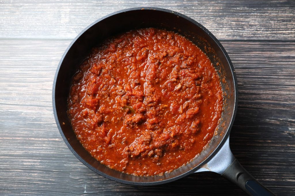 - 1.2.0.3 ③野菜類の水分が抜け甘みが出てきてしっかり炒まったら焼けた肉、トマト缶、ローリエ(あれば)を全部入れトマト缶の水分が少なくなるまで煮込んでいく。塩、白コショウで味を調えたらソースは完成。別の容器に入れ保存する。又は冷凍も可能。