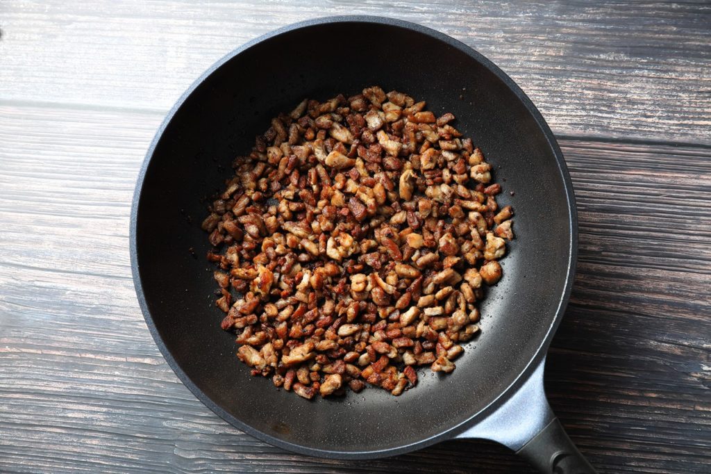 - 1.2.0.1 ①豚肩肉を小さめにカットして塩、白コショウをしてフライパンでしっかりと焼いていく。