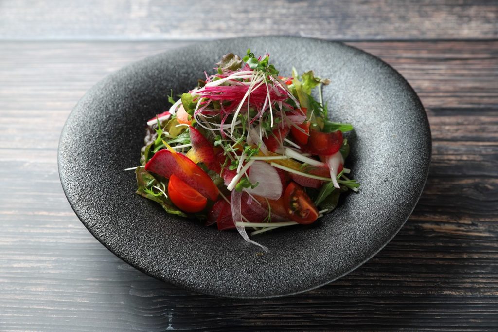 ②葉物野菜は適度な大きさにちぎり、カラフル野菜と混ぜ合わせドレッシングを絡めて皿に盛り付ける。
