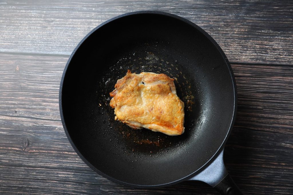 - 1.2.0.4 ④鶏もも肉は全体に白コショウ、塩をして皮面からじっくり焼いていく。