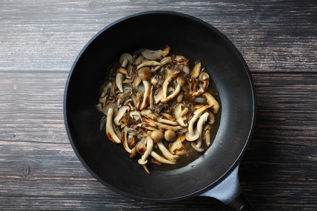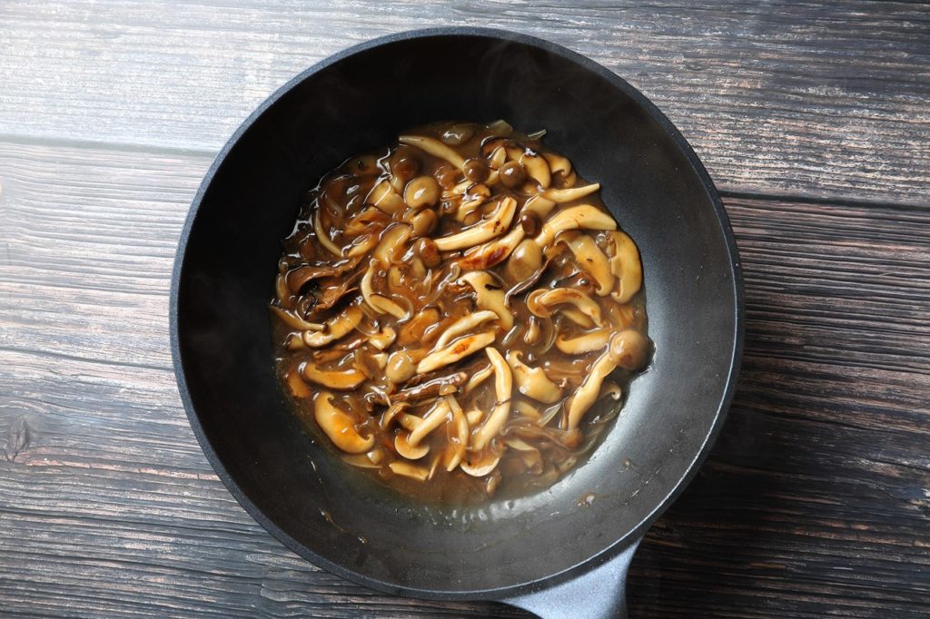 - 1.2.0.1 ①茸クリームソースを作る。玉ねぎスライス、ぶなしめじ、シイタケをしっかり炒める。その後白ワインを入れ少し煮詰めていく。