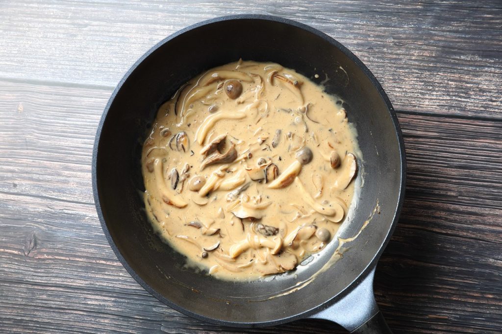 ②ポルチーニの戻し汁があればブイヨンと一緒に入れさらに煮詰めていく。白コショウ、塩で軽く味をつけ水溶き片栗粉(又はコーンスターチ)でとろみをつけていく。
