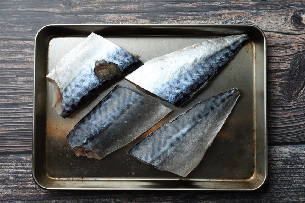 ①塩サバを掃除する。出来れば薄皮と中骨を取り除く。わからない場合はそのままカットしても良い。