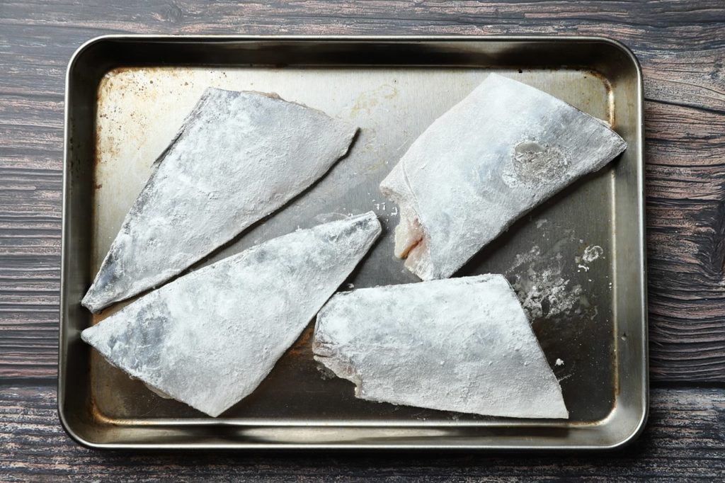 ②片栗粉を全面に付け、余分な粉はしっかり落としておく。