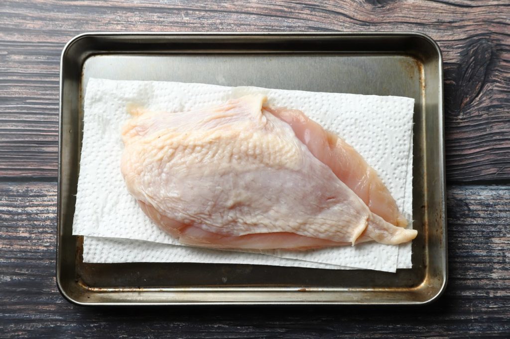 ①フライパンに油をひき、鶏むね肉を皮面からじっくり焼いていく。
