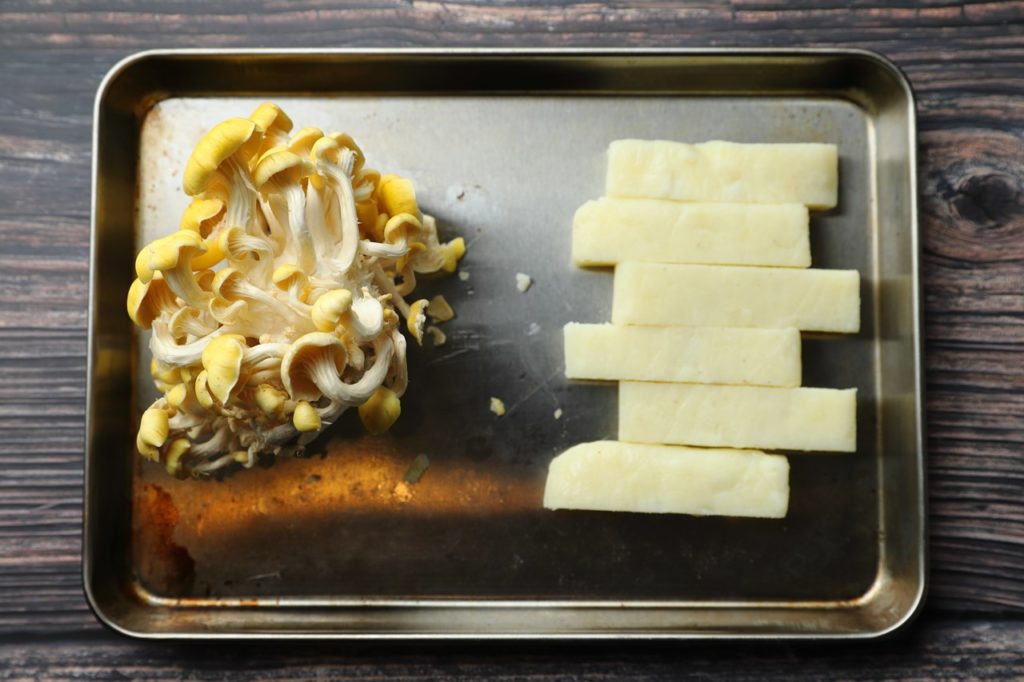 ③付け合わせのハッシュポテト、たもぎ茸はフライパンで焼いておく。(付け合わせは何でもよい)