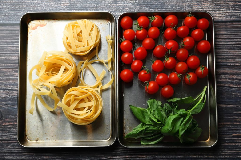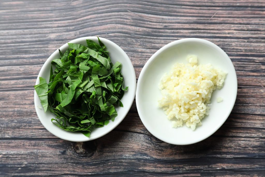 ①ニンニクはみじん切りに、バジルは適度な幅で切っておく。