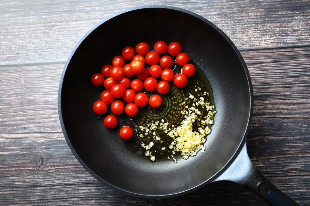 ②プチトマトはヘタを取り軽く洗ってニンニクのみじん切り、多めのオリーブオイルと一緒にフライパンに入れ弱火にかける。