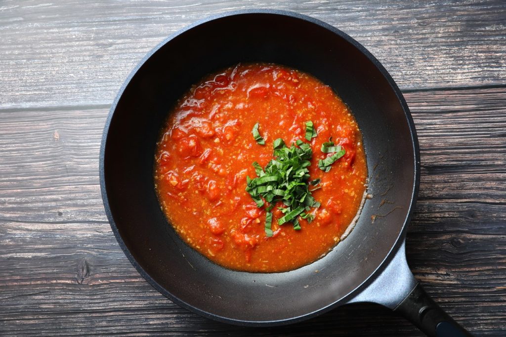 ③にんにくの色が茶色くなったらプチトマトを潰しながら混ぜていき、写真のような状態にする。刻んだバジルも入れる。