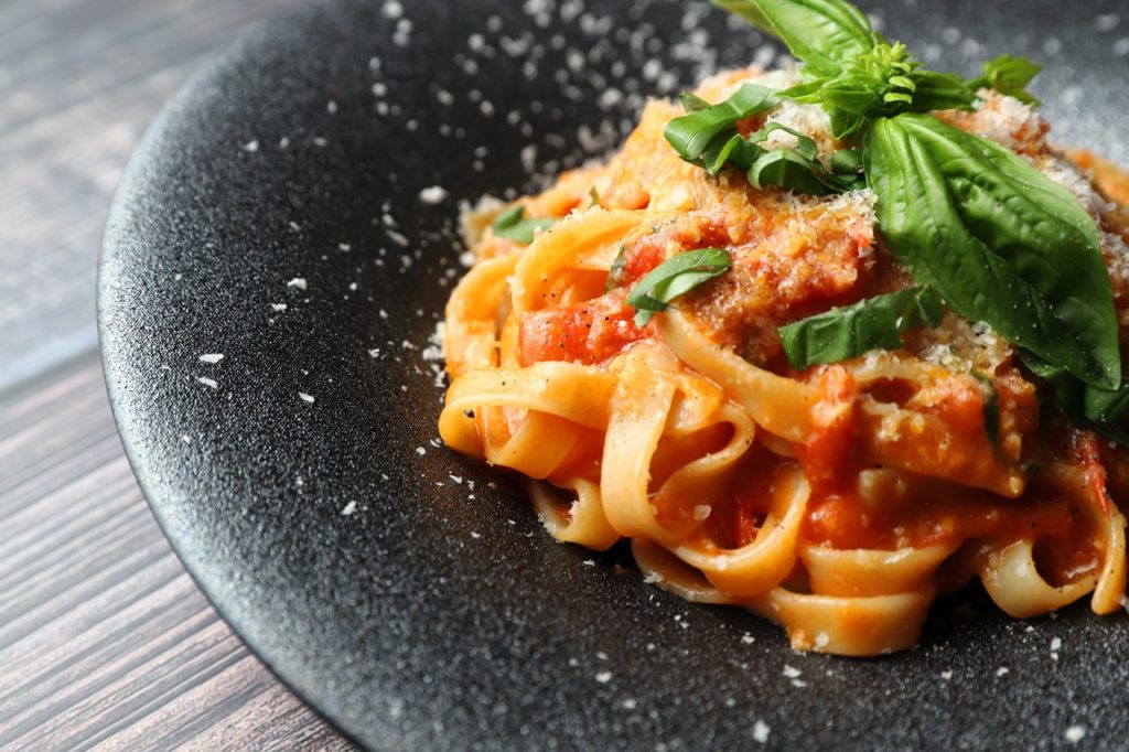 ⑥皿に盛り付けパウダーチーズ、刻んだバジルを仕上げに。