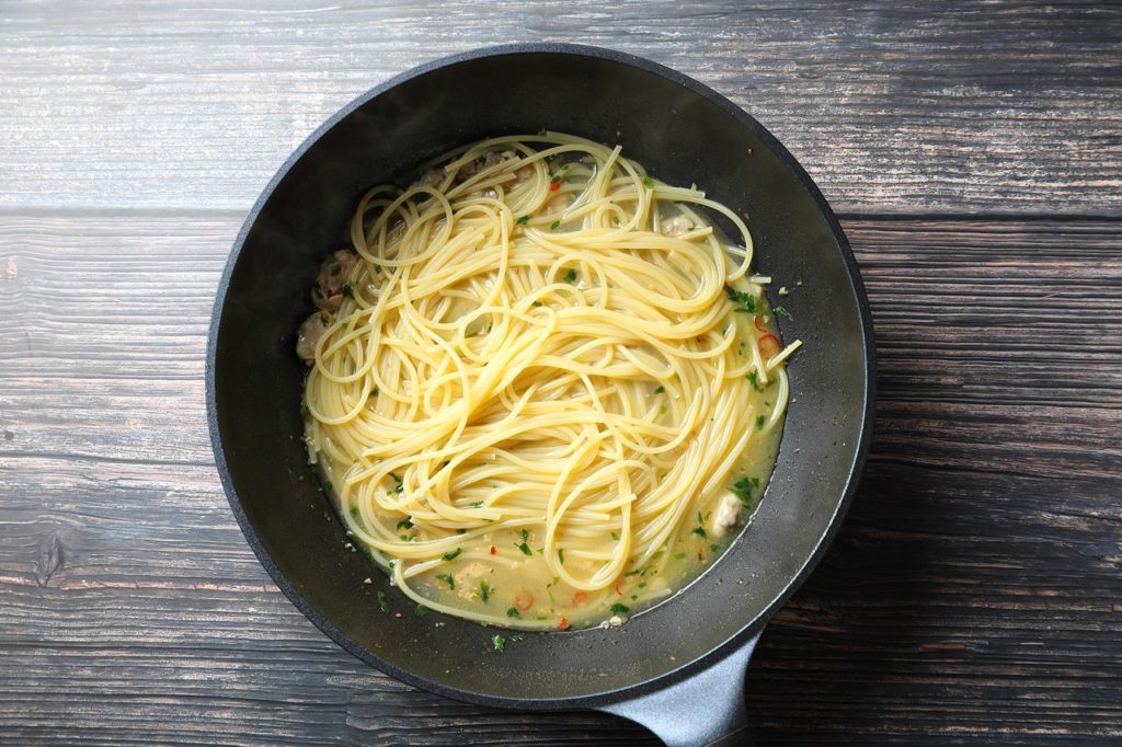 ②パスタを茹でていく。かなり硬めに茹であげる。先ほど作ったソースはアサリを抜いておき、茹でたパスタを入れる。ゆで汁も多めに入れ強火で煮詰めながらパスタに液体を吸収させ、仕上げていく。