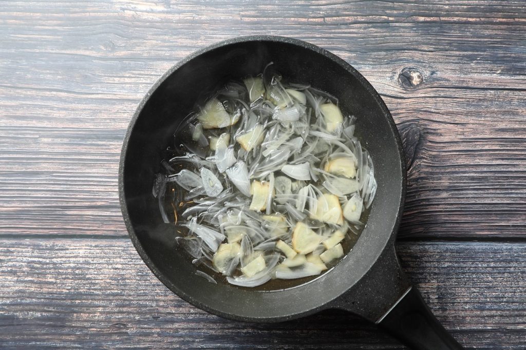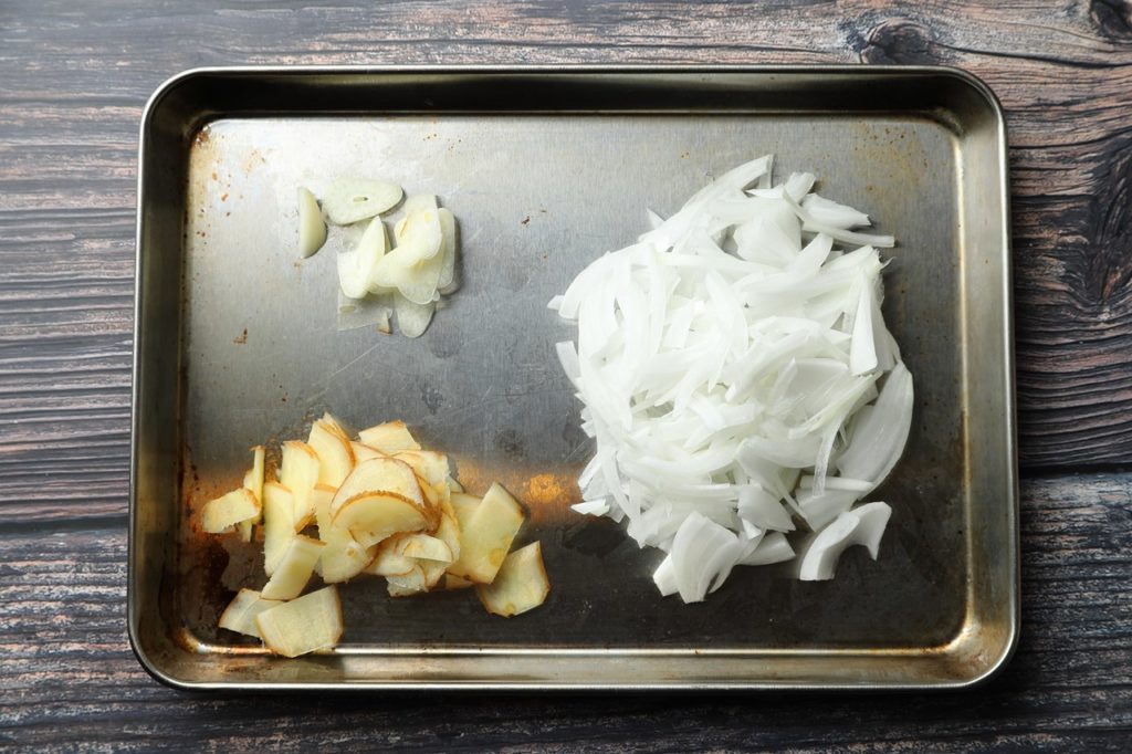 ①たまり醤油のソースを作る。まず玉ねぎ、生姜、ニンニクはスライスにしておく。チューブの場合はそのまま使う。