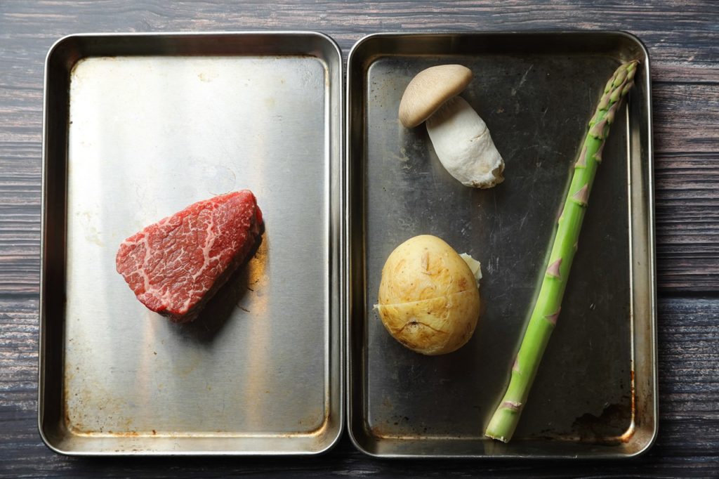 ⑤ジャガイモ、大黒本しめじ、アスパラに火を入れそれぞれ盛り付ける。焼いた肉をのせソースをかけたら完成。